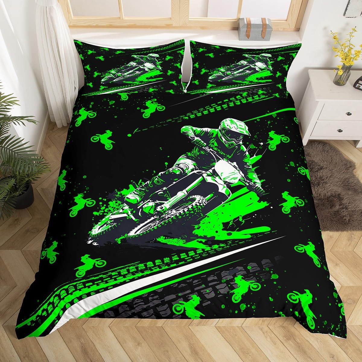 Feelyou Dirt Bike Bedding Set Twin Size Racing Mot... Moreocross Rider Comforter Cover Set for Boys Teens Extreme Sports Duvet Cover Breathable Green Black Bedspread Cover Room Decor Motorcycle Quilt Cover Multi 10 Twin Less