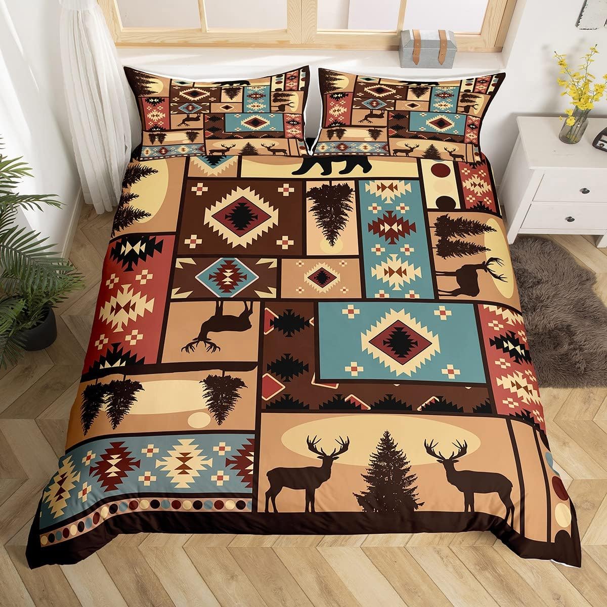 Wild Animal Duvet Cover Retro Exotic Boho Plaid Be... Mai multdding Set Wild Bear Deer Antlers Hunting Comforter Cover for Boys Girls Children Bedroom Decor Brown Bedspread Cover King Size With 1 Pillow Case Multi 21 King Mai puţin