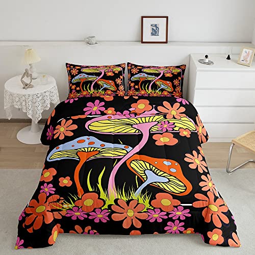 Groovy Flower Comforter Set for Girls Boys Retro F... Mai multloral Boho Mushroom Comforter 70S Hippie Flowers Bedding Set Room Decor Psychedelic Duvet Set Full Size Quilt 3Pcs Boys Mai puţin