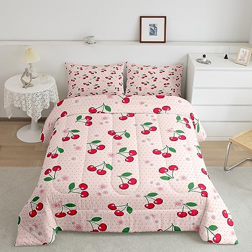 Feelyou Red Cherry Duvet Set Cartoon Fruit Comforter Set for Girls Women Bedding Set Girly Cute Fruit Comforter Pink 1 Comforter Set with 2 Pillowcase