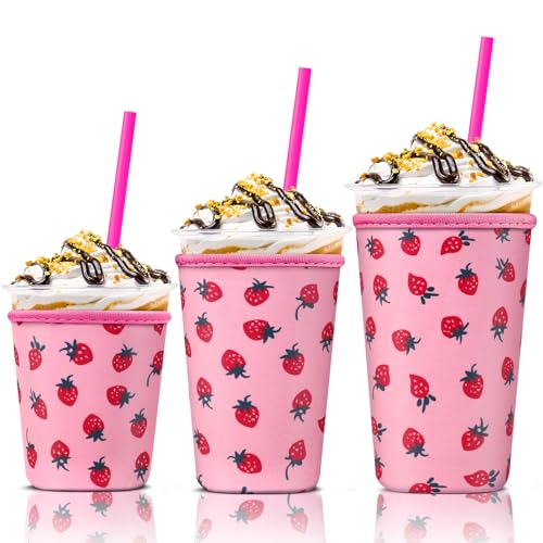 Iced Coffee Cup Sleeve for Large Sized Cups, Reusa... Moreble Neoprene Iced Coffee Cup Holder for Hot Cold Drinks, Compatible with Starbucks, Dunkin Donuts, and More (Pink Strawberry) Less