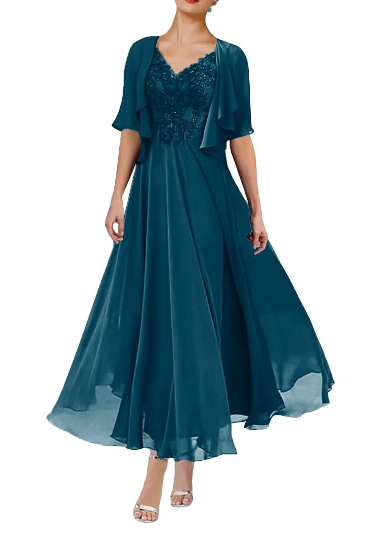 2 Piece Tea Length Mother of The Bride Dresses with Jacket Short Sleeves Lace Formal Evening Gown with Pockets Peacock 18 Plus