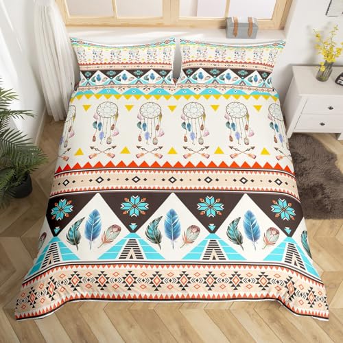 Erosebridal Dream Catchers Bedding Set Queen for G... Moreirls Boys Boho Exotic Tribal Style Duvet Cover 3 Piece Bohemian Stripes Print Comforter Cover Western Aztec Bedspread Cover Exotic Feather Bedding Less