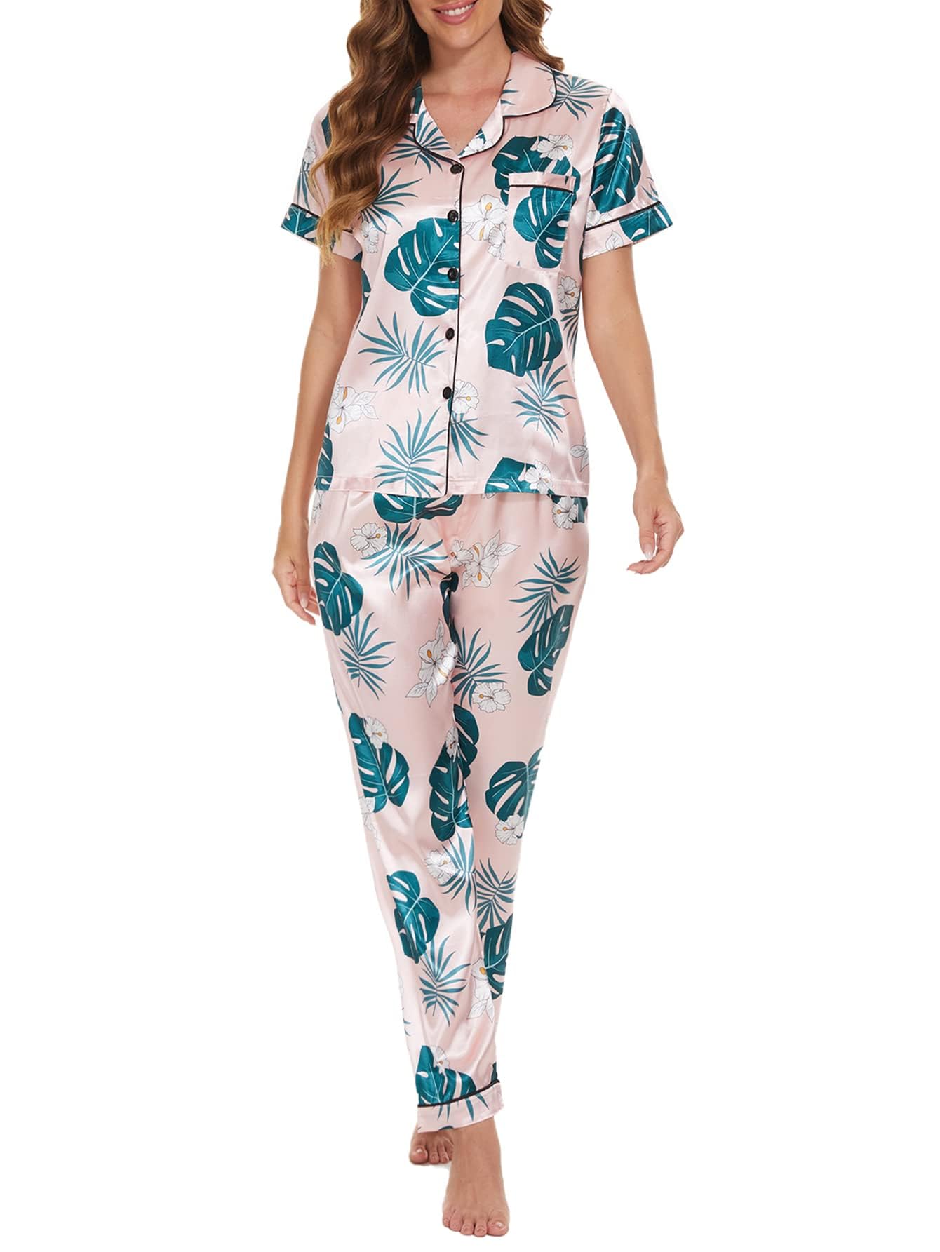 MyFav Womens Silk Satin Pyjamas Set Short Sleeve Sleepwear Two-Piece Pj Sets Button-Down Loungewear S-2XL M Pink Long