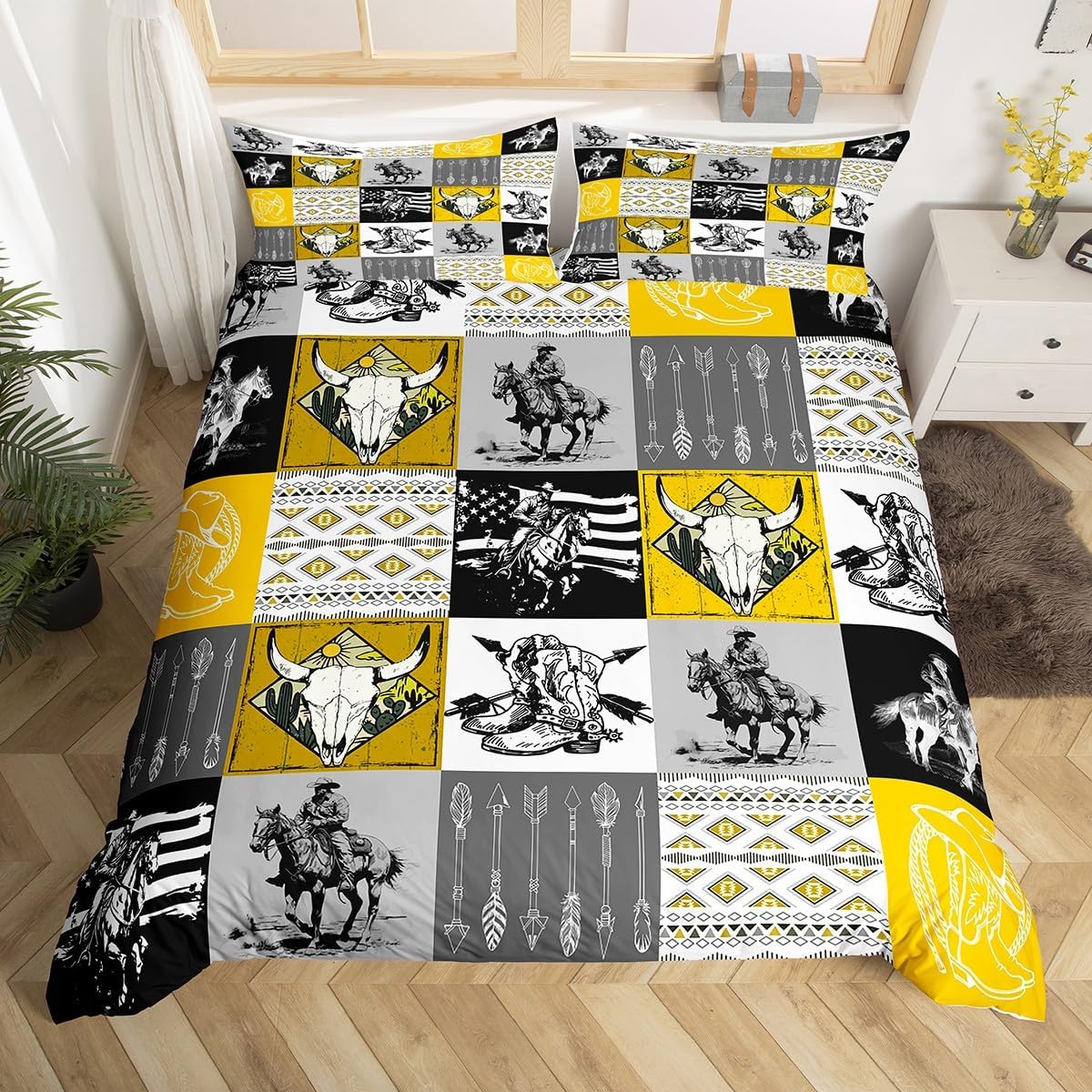 Western Horse Decor Duvet Cover Wild West Cowboy B... Moreedding Set for Kids Boys Girls Teens Room Decor Rodeo Cowboy Style Comforter Cover Set Full Size Yellow Grey White Bedspread Cover 3Pcs Zipper Multi 35 Full Less