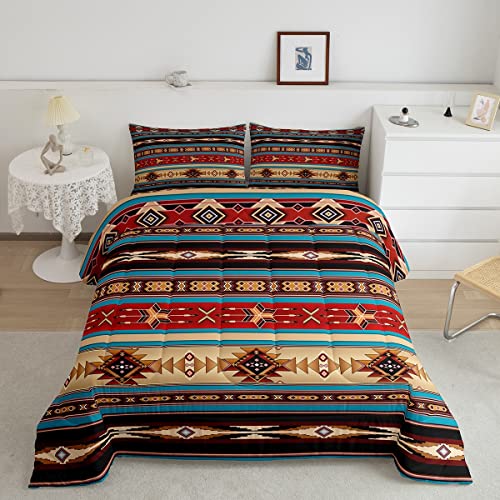 Aztec Bedding Set Ethnic Tribal Arrow Queen Comfor... Moreter Set,Vintage Southwestern Native Bohemian Quilt,Western Star Duvet Insert Exotic Geometric Diamond Stripes Room Decor,Red Blue Dark Brown Less