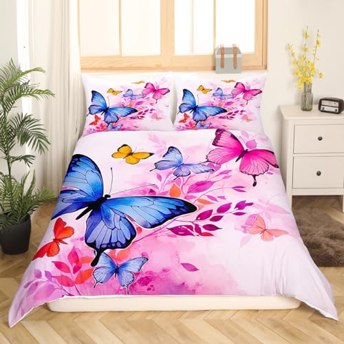 Blue Butterfly Bedding Set Queen for Girls Pink Tie-Dye Duvet Cover Rustic Garden Theme Comforter Cover Colorful Butterfly Print Bedding Dream Themed