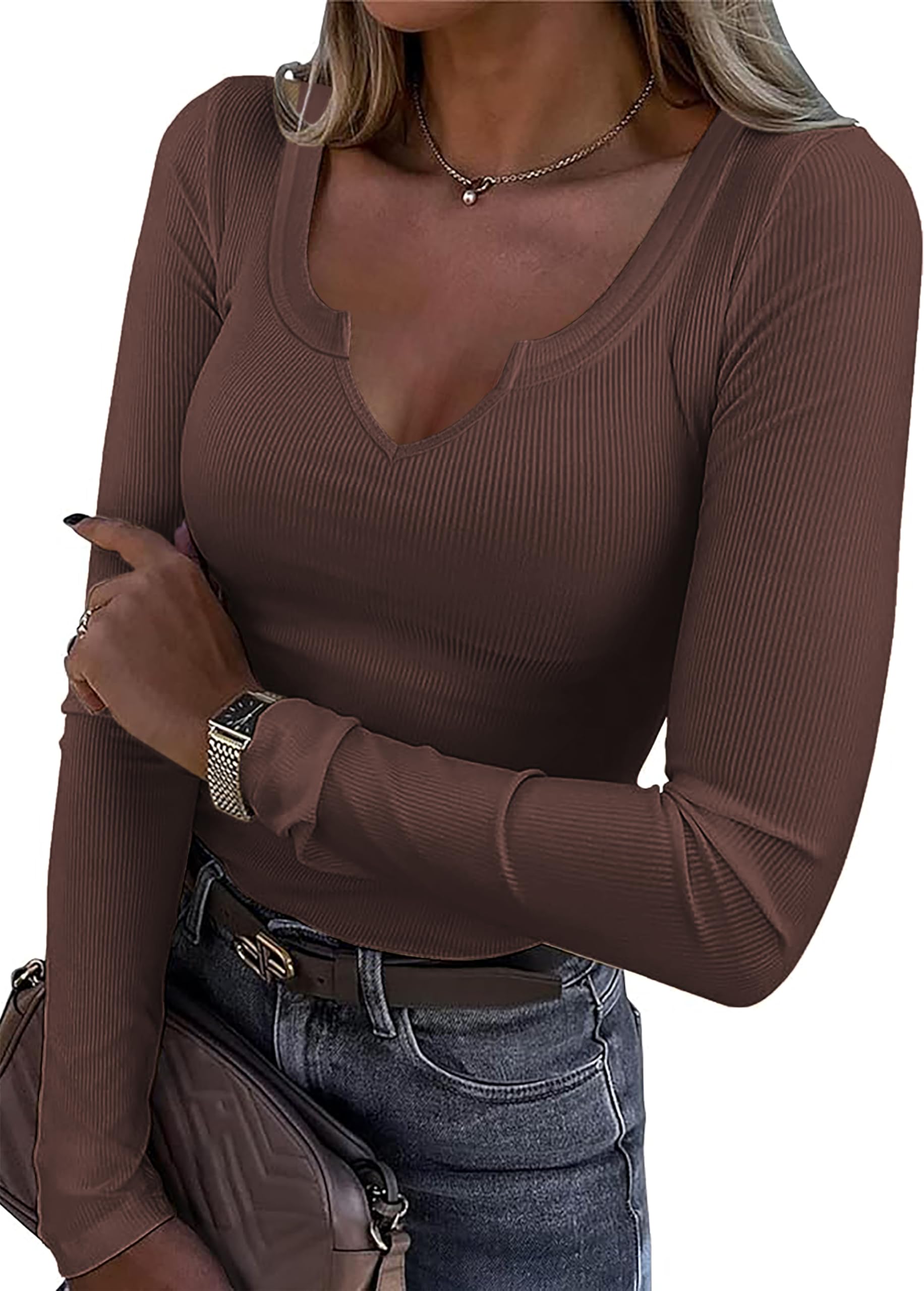 iGENJUN Women's V-Neck Ribbed Long Sleeve Shirts Fitted Basic Slim Knit Tops Spring Outfits 2024 Clothes Small Brown