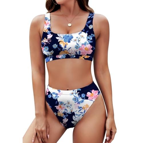 Pink Queen Women's Crop Top High Waisted Cheeky Bikini Set Two Piece Swimsuits X-Large 02 - Floral Navy Blue