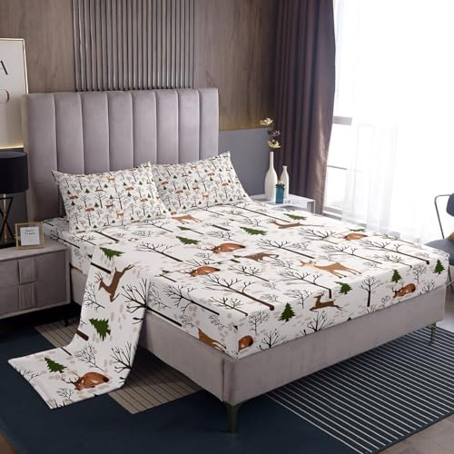 Kids Cartoon Deer Fitted Sheet Toddler Cute Brown Elks Bedding Set Jungle Wild Animals Bed Sheet Set for Children Boys Girls Nature Woodland Trees She