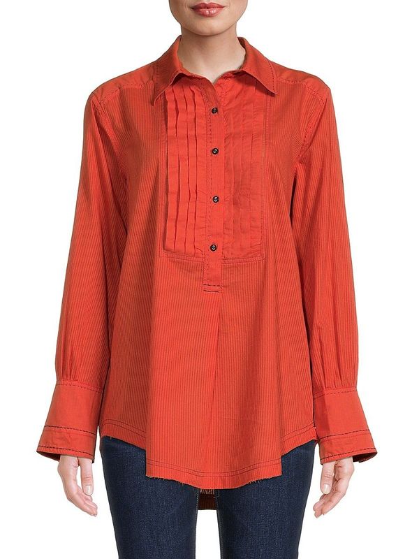 Taking design cues from a tuxedo shirt, this Free ... MorePeople shirt features contrasting stitching. The neckline has a sharp collar followed by a pleated placket and casual button cuffs. Style yours with a pair of denim. Spread collar Long sleeves Pullover Button placket Button cuffs Cotton Machine wash Imported SIZE &amp; FIT About 32 from shoulder to hem Model shown is 5'10 (177cm) wearing US size Small/. Womens - W Trend Separates &gt; Saks Off 5th. Free People. Color: Tiger Red. Size: XS. Less