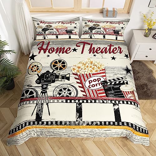 Vintage Cinema Style Bedding Set Full for Boys Gir... Morels Family Home Theater Decor Duvet Cover Movie Themed Comforter Cover Retro Movie Theater Decor Bedding Movie Night Film Theme Bedspread Cover 3 Pcs Less